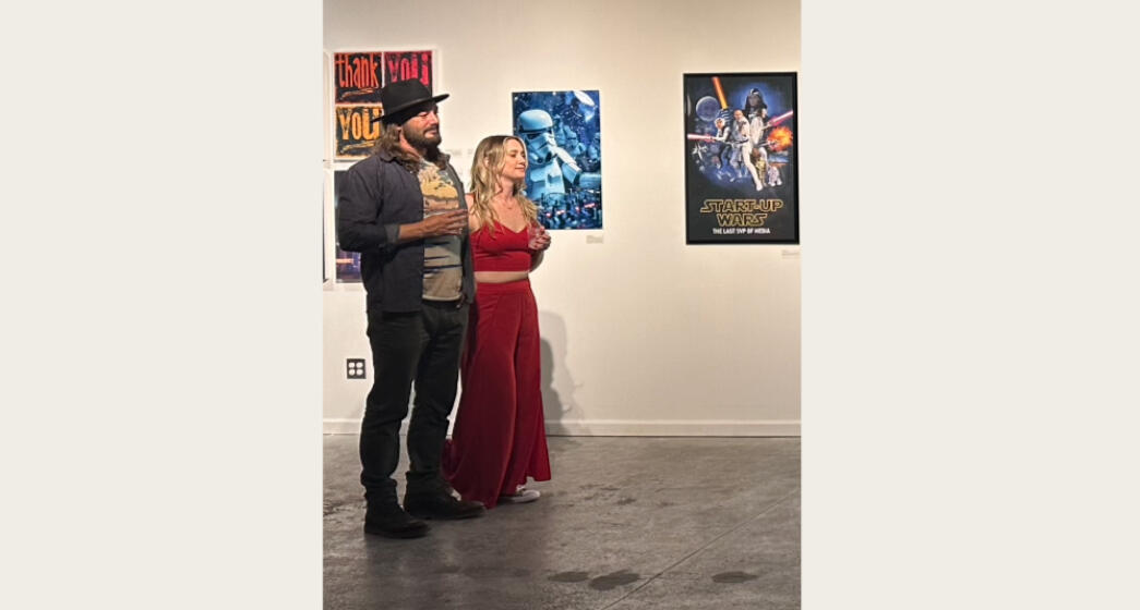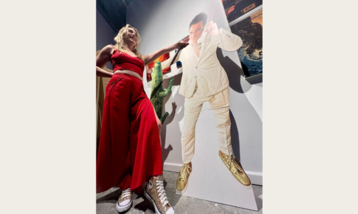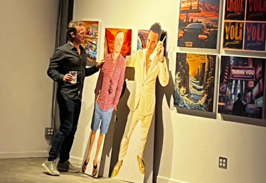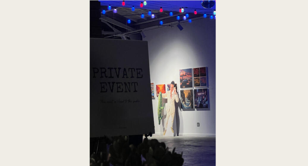 ➔ A studio art gallery hung floor-to-ceiling with custom AI artwork capturing his legacy