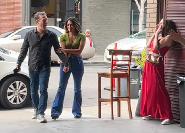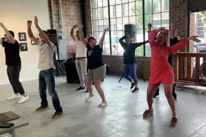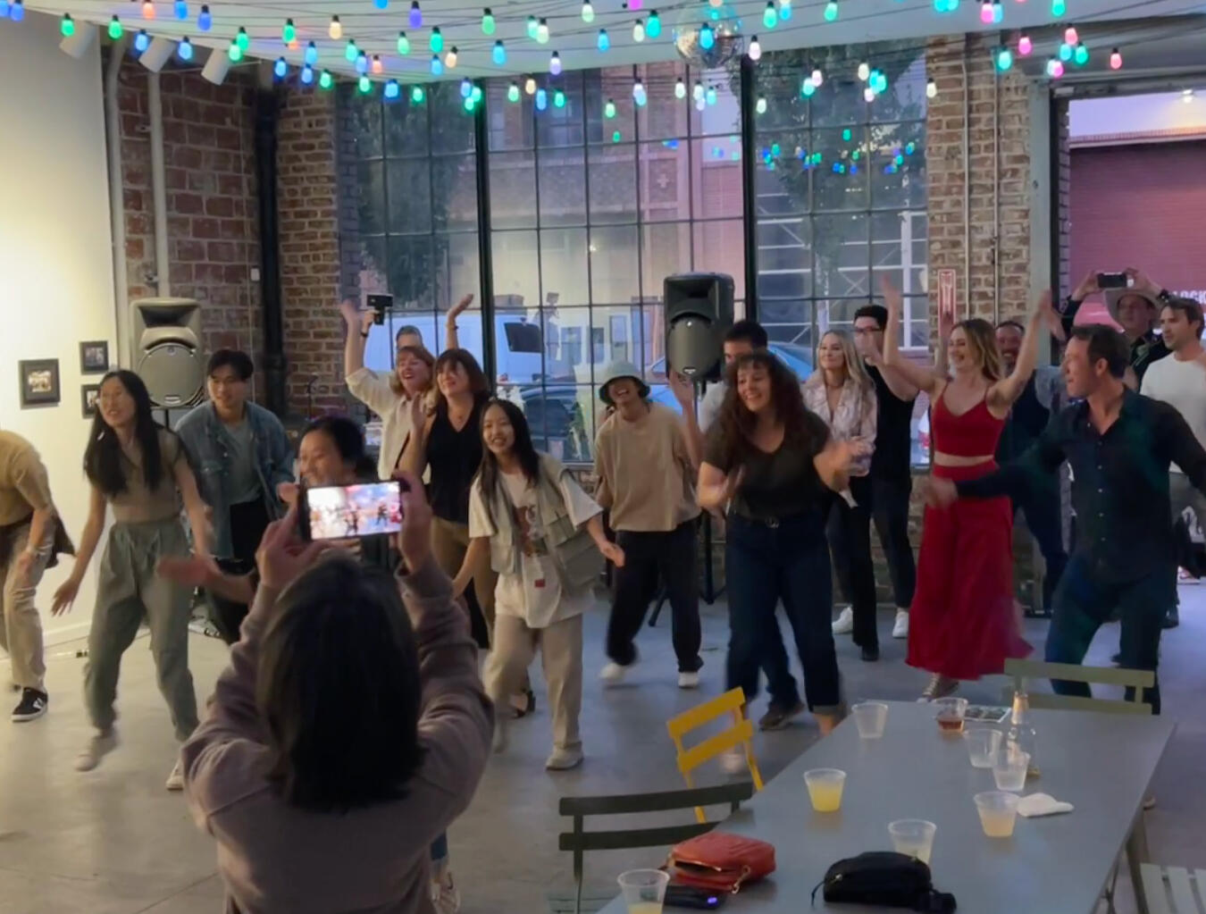 ➔ A flash mob breaks into an inside-joke choreography where, halfway through, pre-rehearsed party guests join in and dance along