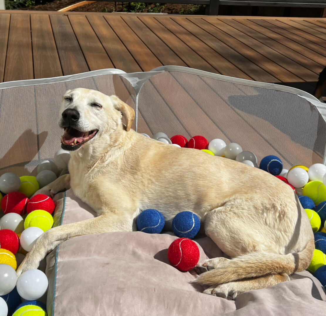 ...but only after we curated her a Sacred Goodbye moment: sinking into a ball pit of hundreds of tennis balls. When the moment to say goodbye came, we surrounded her with t-shirts carrying the scent of her favorite humans as her beloved mama and papa sang her her favorite songs, looking into her eyes until they closed shut.